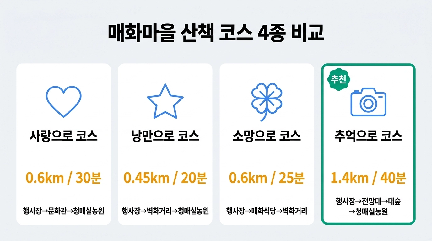 그런데 "매화마을이 넓어서 어디부터 봐야 할지 모르겠다"는 분들이 많아요. 그래서 공식 산책 코스 4가지를 정리해 드릴게요.